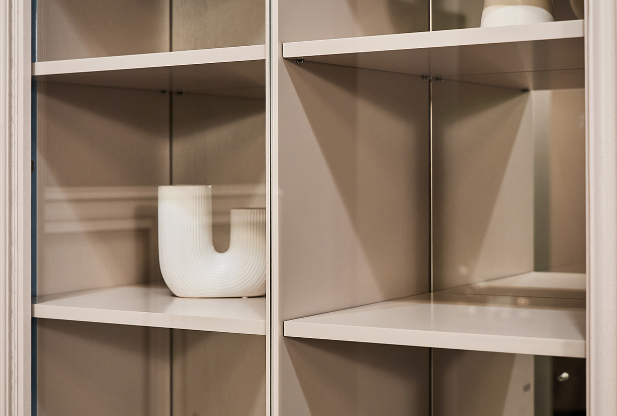 ✅ Задняя стенка витрины украшена зеркалом, которое визуально расширит пространство и наполнит интерьер дополнительным светом.
