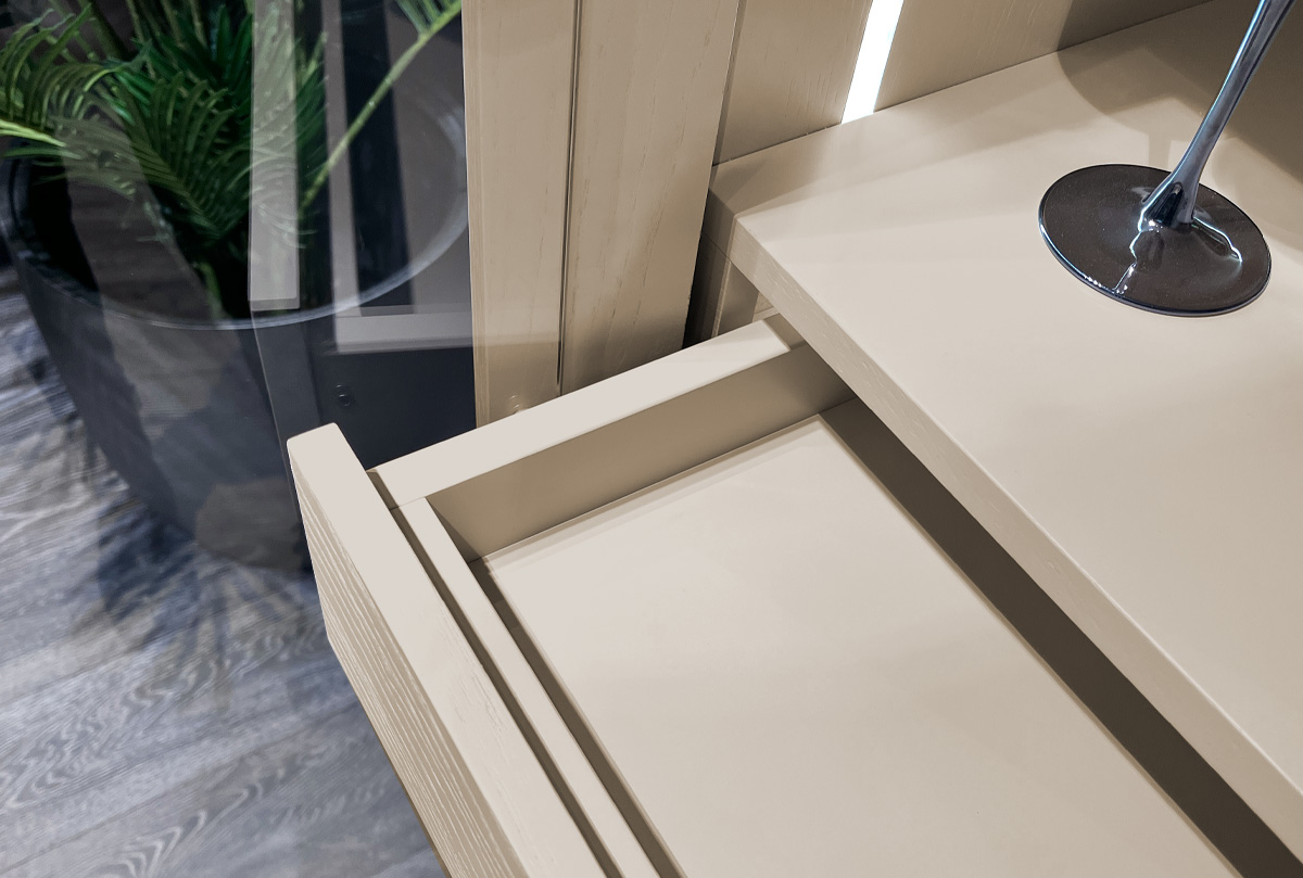 ✅ Корпус, полки и фасады выдвижных ящиков изделия изготовлены из шпонированного дубом МДФ класса безопасности Е1.