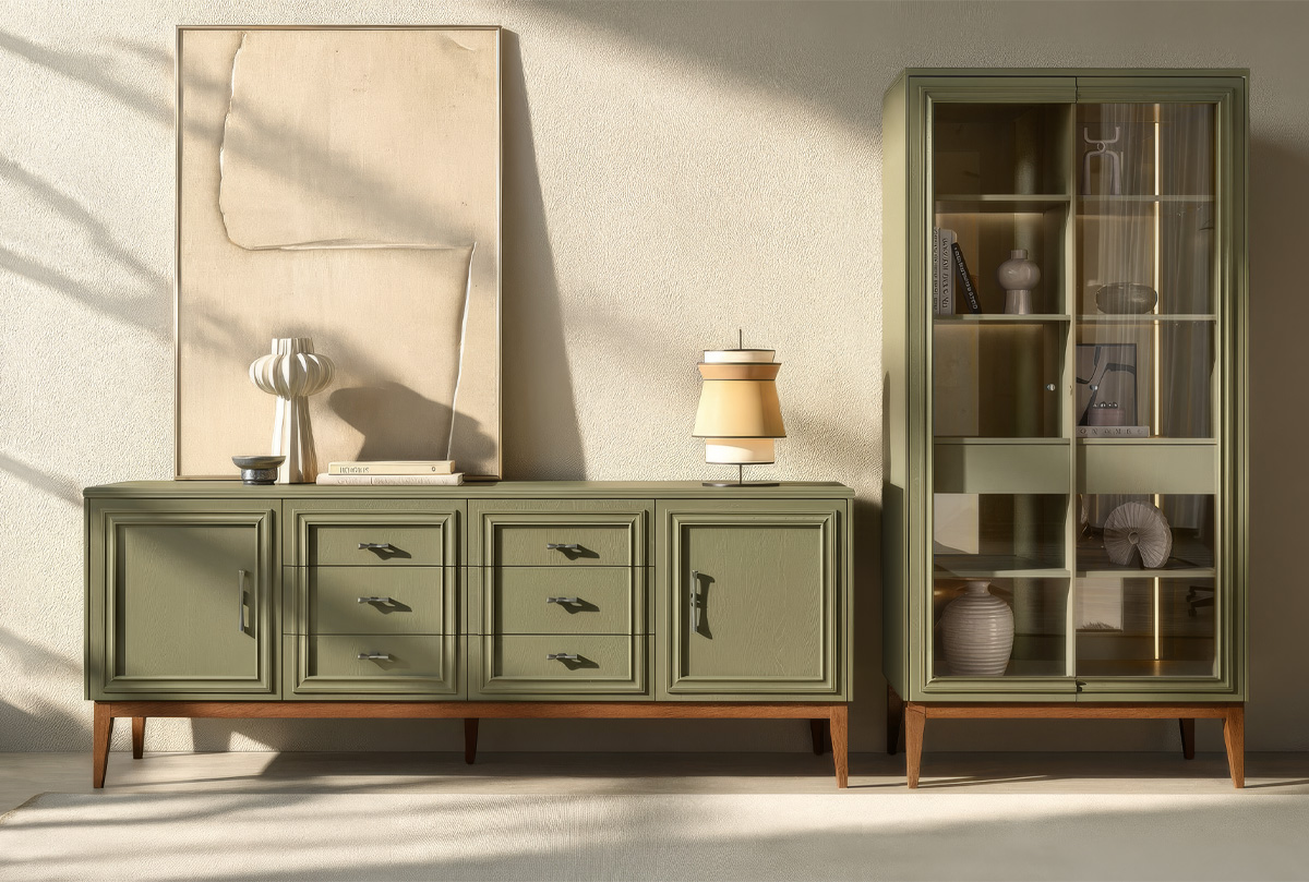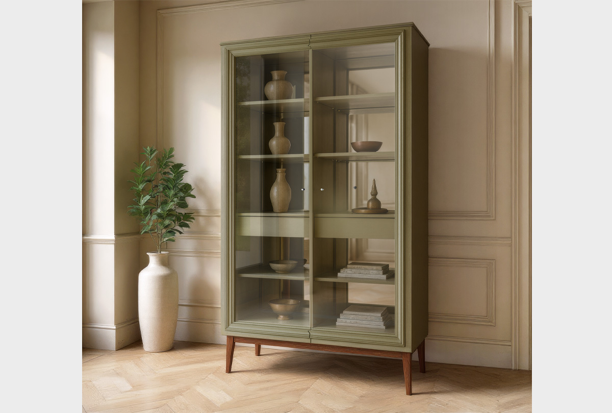 Вместительная двухдверная витрина «Сакраменто» в цвете «олива, орех» в стиле американской классики – идеальное решение для вашей гостиной.