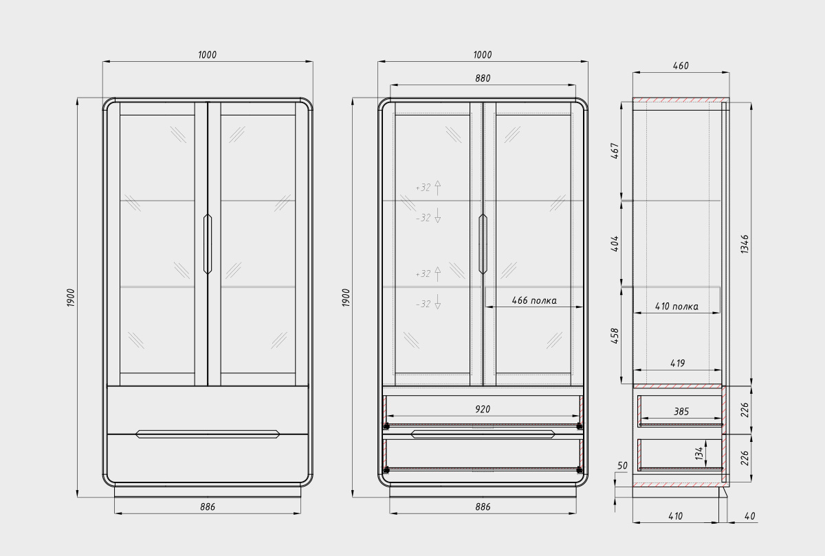 ✅ Размеры: ширина — 1000 мм, высота — 1900 мм, глубина — 460 мм.