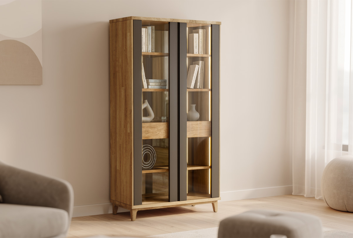 ✅ Полки из массива дуба визуально подчеркивают натуральность и надежность изделия. Благодаря деревянным полкам в витрине можно хранить книги, ставить вазы и не беспокоиться об излишней нагрузке полок.