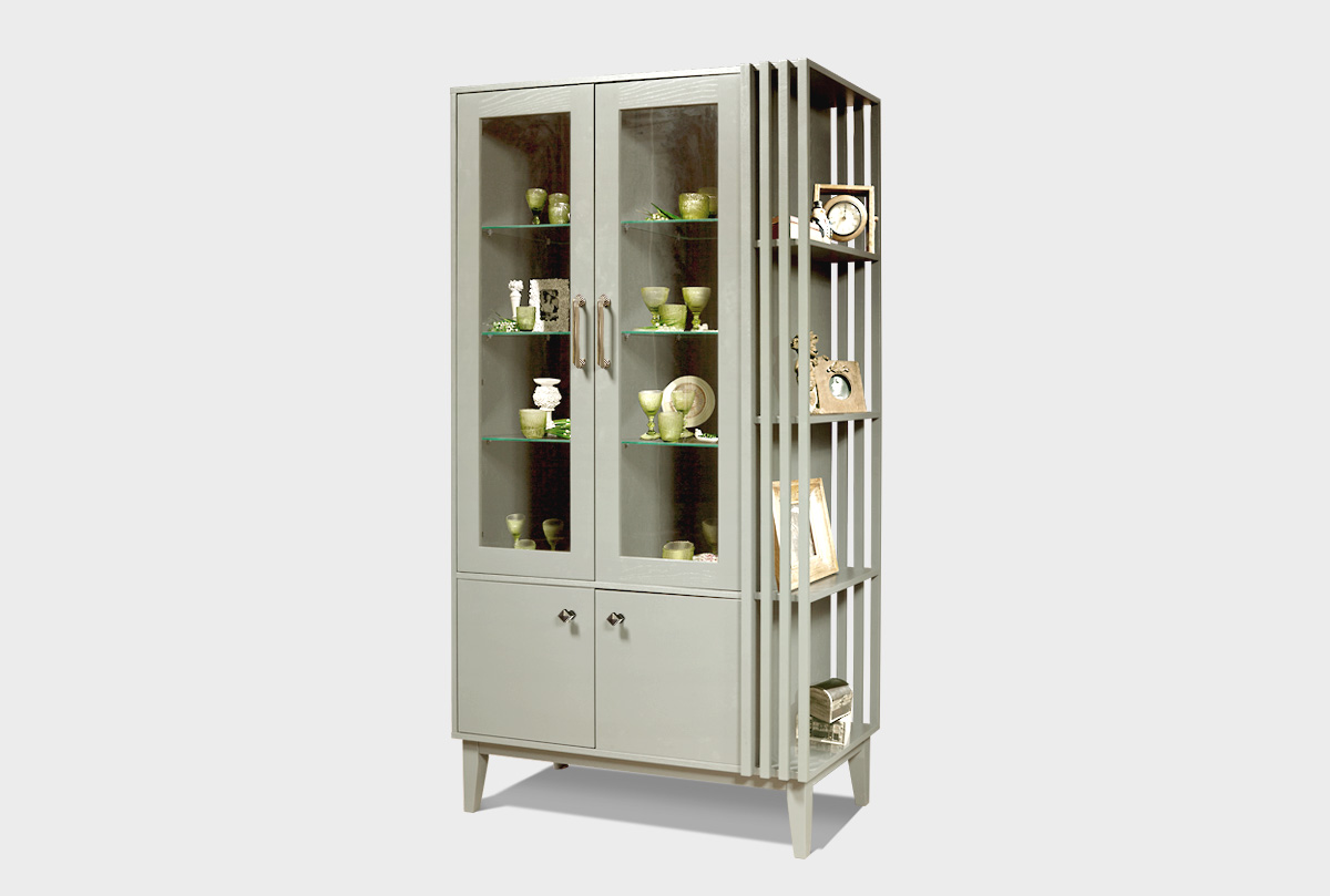 ✅ За двумя стеклянными распашными дверьми расположены 6 съемных полок, за двумя глухими дверьми расположены 2 съемные полки (по одной полке в каждом отделении).