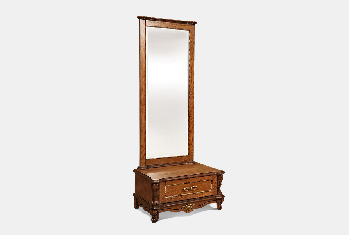 Благородный дизайн и оригинальность – напольное зеркало «Алези» (Alezi) изюминка коллекции. Декоративные элементы, такие как инкрустация по технологии маркетри, изящная «юбка» с резьбой в виде волны и необычная фурнитура делают это зеркало поистине роскошным предметом интерьера. Сочетание оттенков бронзы, золота и слоновой кости подчеркивают элегантность итальянского стиля. Напольное зеркало – предмет, имеющий и практическое значение. Оно визуально расширяет пространство, а встроенный выдвижной ящик послужит для хранения разных мелочей.