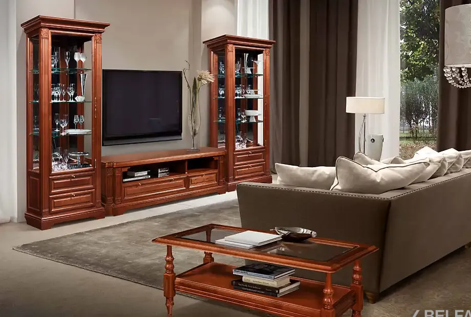 Гостиная "Престиж" (вариант 1) – это классические витрины и тумба под ТВ из массива берёзы в сочном и в то же время благородном оттенке «мокко». Дополните гостиную журнальным столом и мягким диваном "Жаклин" – комфортный просмотр ТВ вам гарантирован!