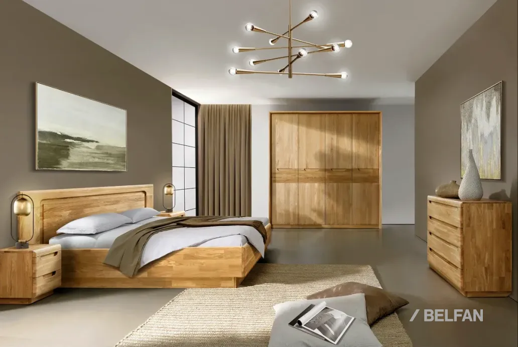 Интерьер спальни «Бремен» (вариант 2) в цвете «дуб натуральный». Кровать, прикроватные тумбы, комод и шкаф четырехдверный выполнены из натурального дуба в современном стиле.