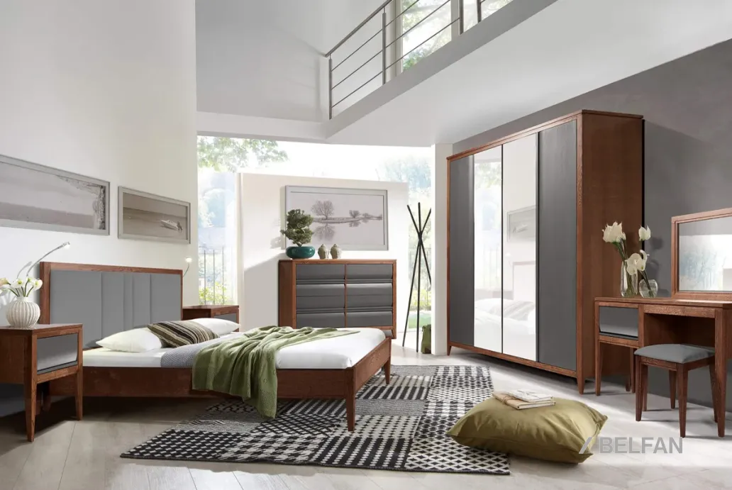 Спальня Дакота, вариант 1 — это превосходный выбор для создания современного интерьера. Её дизайн отличается прямыми строгими формами, высокими утончёнными ножками и акцентными фасадами в глубоком насыщенном оттенке, который идеально сочетается с натуральной текстурой дерева.