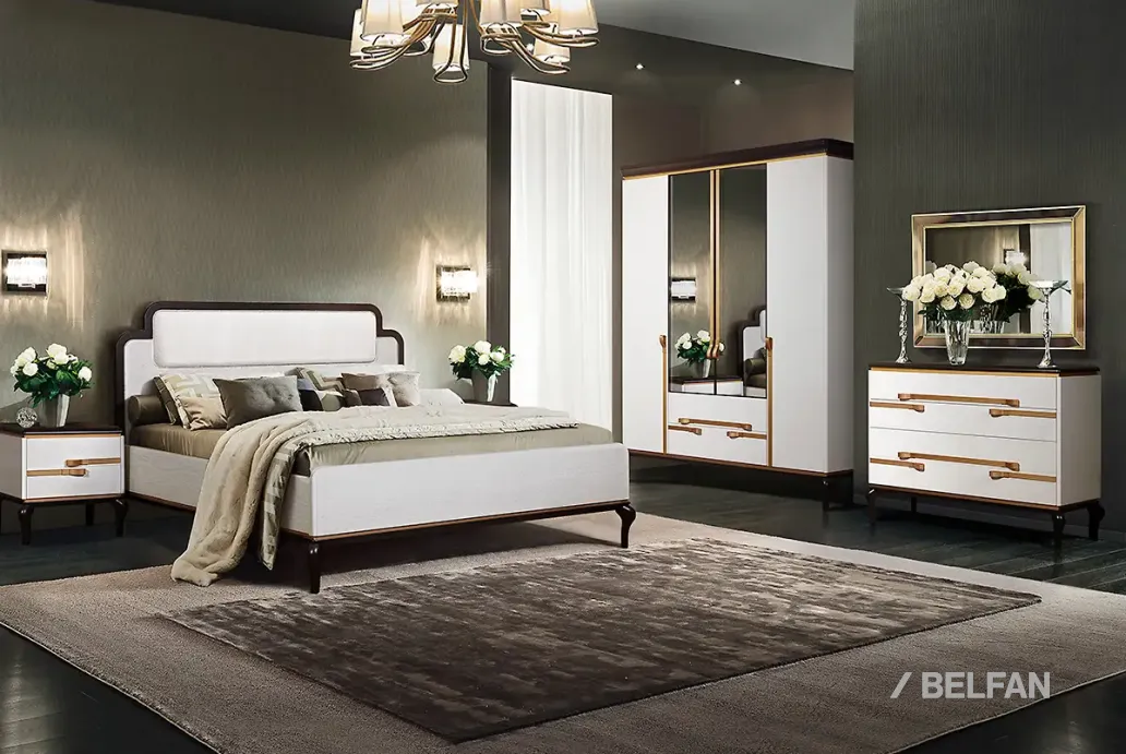 Мебель для спальни в итальянском стиле Мадлен, интерьер вар. №1 в благородном цвете "альба+ черная эмаль". Включает в себя: Кровать, шкаф для одежды, комод и зеркало дополняет картину.